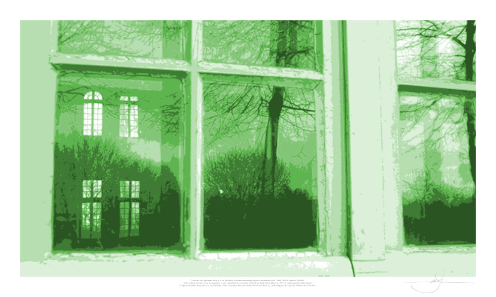 D’après une photo prise par A.A. de Sauvanie, reflets hivernaux dans une fenêtre de la Grote Kerk (la Grande Église) de Veere en Zélande aux Pays-Bas